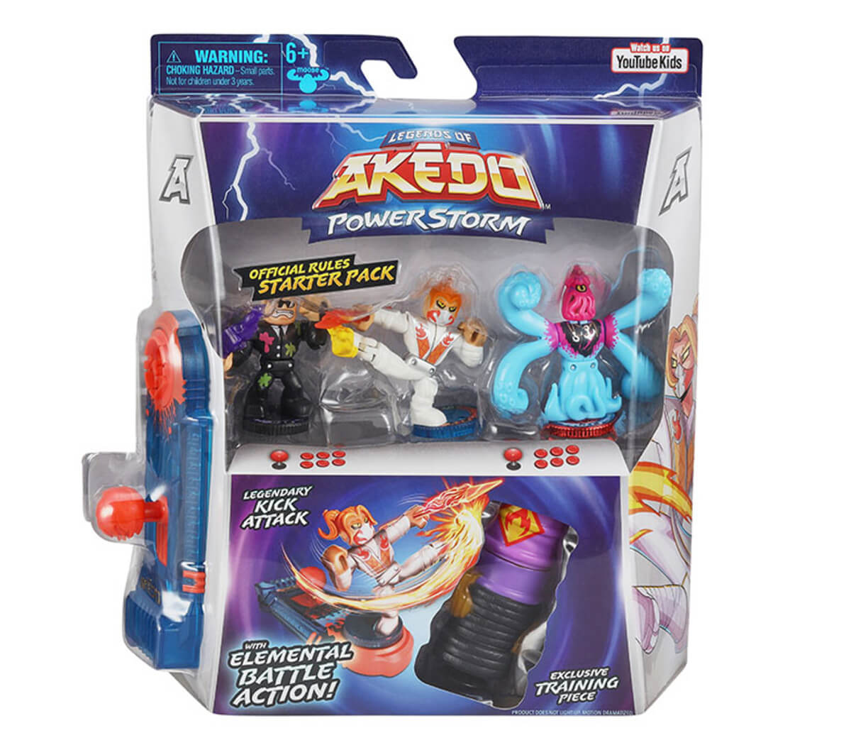 Prepare for battle with Legends of Akedo Powerstorm Official Rules Starter Pack. This special pack gives you all you need to play the official tournament rules of Akedo. Train your Warriors to be their best and practice using the bonus training piece. It’s perfect for getting your Warriors match ready as they perfect the ultimate Split Strike. This Starter Pack includes three Arcade Warriors: One of which is a Legendary Warrior with a realistic kicking or punching action who can deliver a Split Strike with their powerful blow. Place your Warriors on your Exclusive Joystick Controller that only comes in this pack and train your team for next level battling action!